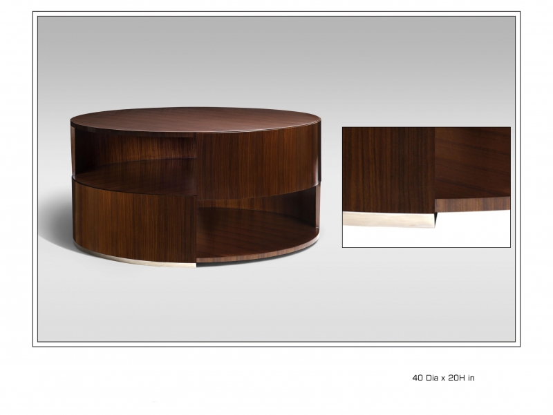 Rosewood Round Cocktail Table with Polished Stainless Steel Base.
