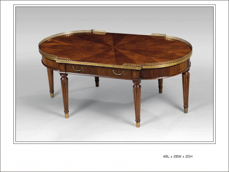 Crown Walnut Cocktail Table with Brass Accents. Available in Mahogany