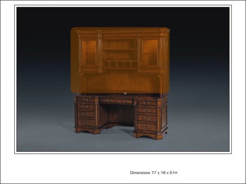 Myrtle Burl Credenza with Right Side Printer Tray and Left Side CPU Storage with 3 CD Drawers, Flip Down Keyboard Center Drawer. Power Strip Located Right Side of Kneehole.