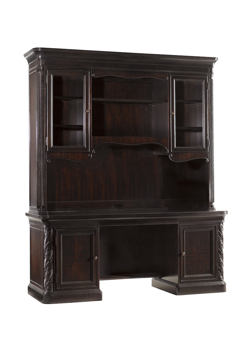Deck for credenza with 2 wood framed beveled glass doors; 5 adjustable wood framed glass shelves; 1 stationary wood shelf; touch lighting; cord management; finished top