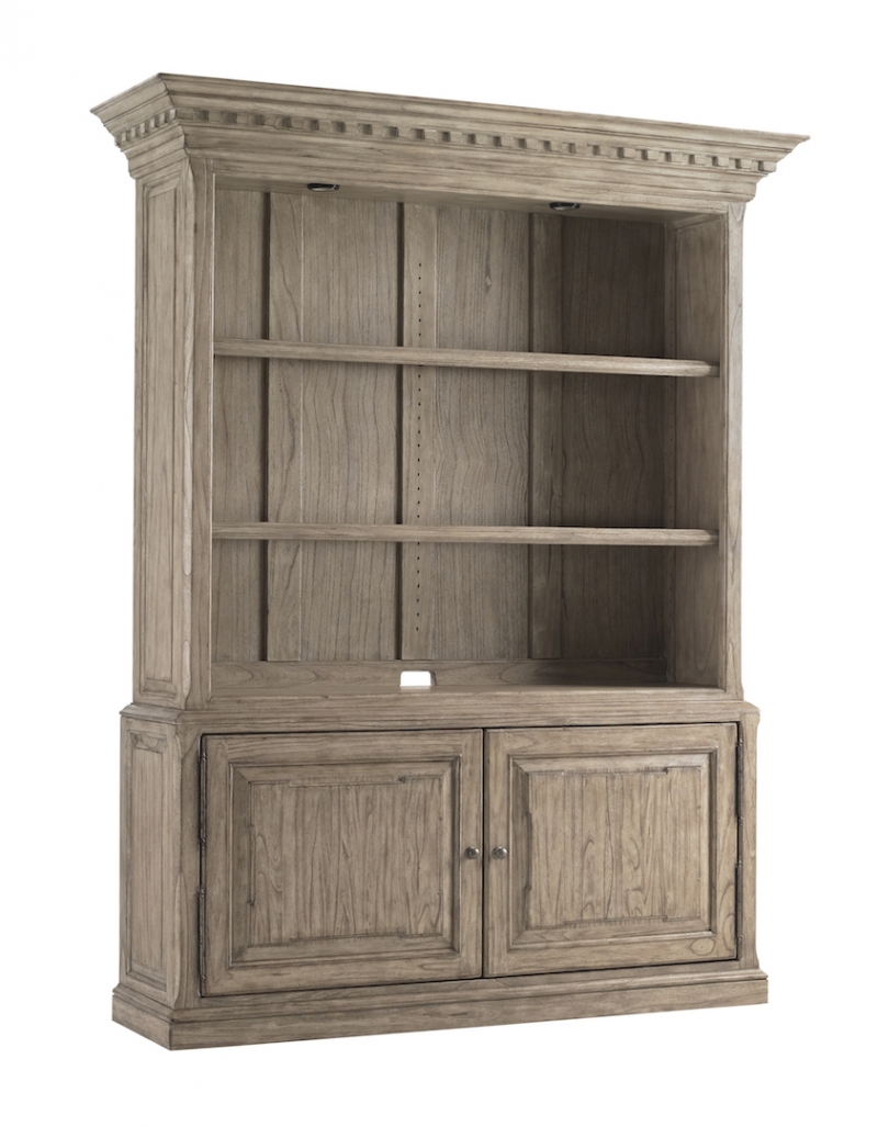 Bookcase: Upper section: 2 wood framed adjustable glass shelves; touch lighting; cord management; ventilation. Lower section: 2 doors; 2 adjustable shelves; cord management grommets for electrical cords