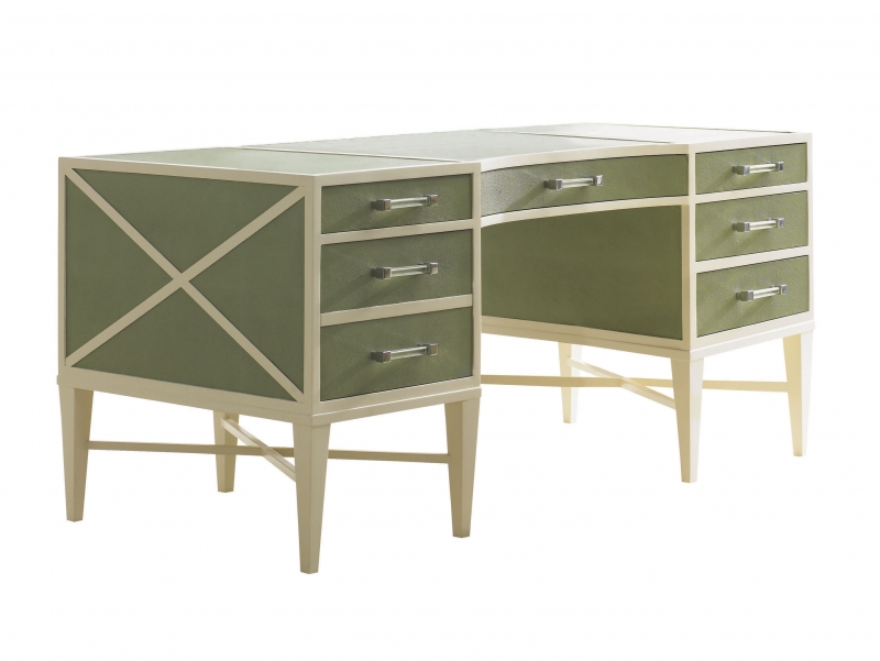 Select hardwoods in an ivory finish with embossed green shagreen top and drawer fronts. Front and side panels have faux shagreen with decorative ivory finished "X" fretwork; acrylic and chrome hardware 1 full-extension file drawer will accommodate legal/letter