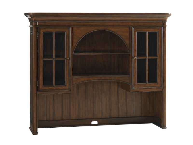 Deck with 2 wood framed glass doors; 3 wood framed glass shelves (2 adjustable); 1 stationary wood shelf; touch lighting; cord management; ventilation
