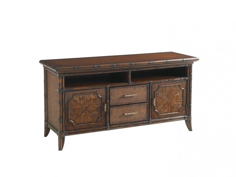 Media Console in decorative bamboo door panels; woven rattan drawer; fronts and end panels 2 doors; 2 full extension drawers; 2 adjustable shelves; 2;open compartments (25W x 4H); 5 outlet surge protector; cord management; ventilation