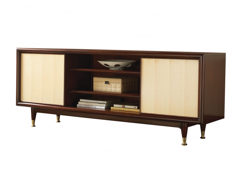 Quartered walnut and sycamore veneers and select hardwoods accented by brass ferrules. 2 doors with figured sycamore veneer panels in a clear finish; 4 adjustable shelves; 5 outlet surge protector; cord management; ventilation access