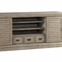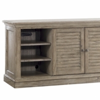 Media Console with 2 swinging louvered doors open 180° so that ends or center section can be open or closed; 1 full extension drawer; 6 adjustable shelves; 5 outlet surge protector; cord management; ventilation