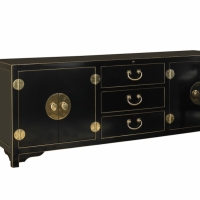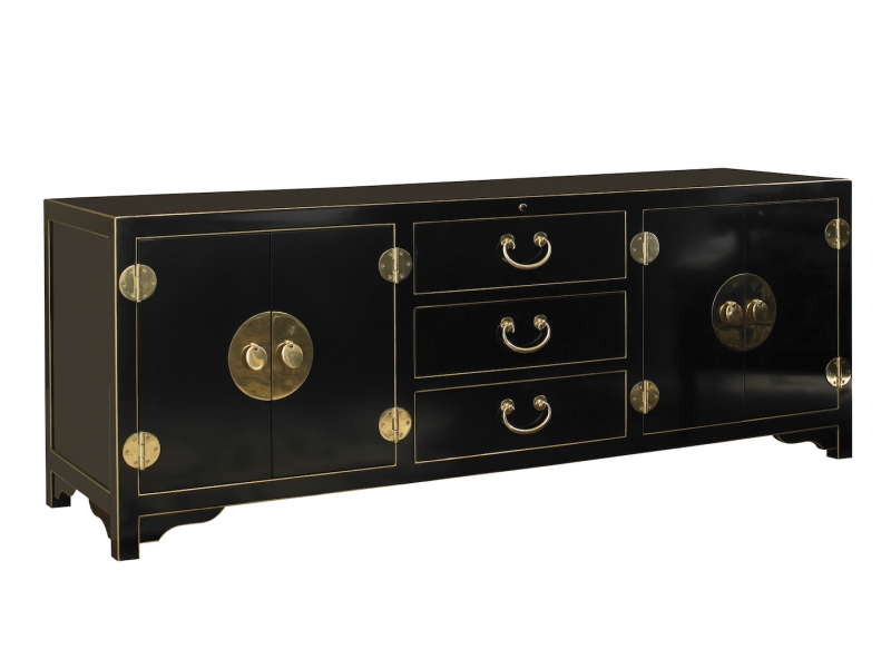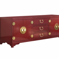 Black or red finish accented by polished brass hardware. 4 doors; 3 drawers; 4 adjustable shelves; 5 outlet surge protector; Infrared Eye allows for remote control of concealed electronic components; cord management; ventilation access