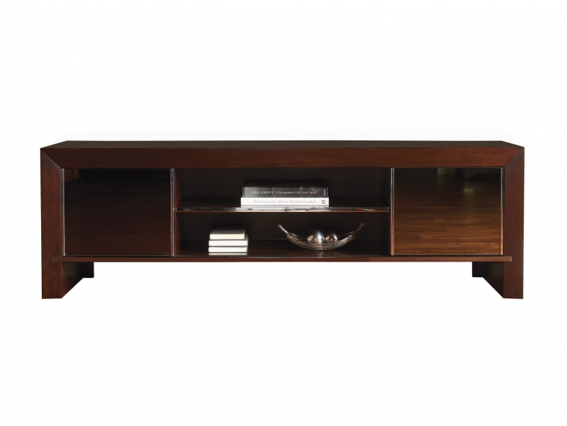 Media Console 2 sliding smoked mirrored doors framed by polished stainless steel; 3 adjustable shelves with a stainless steel front rim; 5 outlet surge protector; cord management; ventilation access