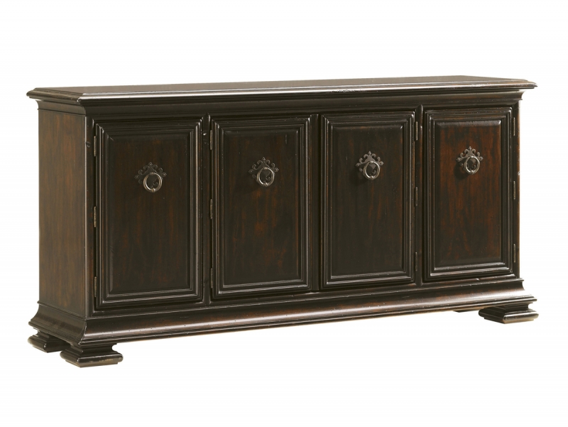 Four raised panel doors adorned with custom hardware pulls with center compartment flanked by three shelves behind the left and right doors. The central interior features two full extension felt lined drawers, with adjustable shelf below. A hand hewn top and square bun feet add elegant detailing to this statement piece.
