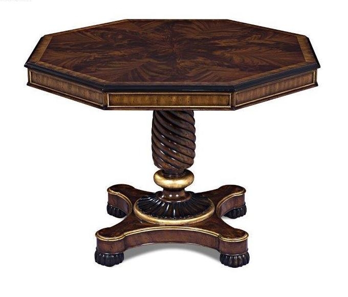 Octagon center table in bleached Mahogany and Avodire veneers. Hand carved twist pedestal base with Gold striping.
