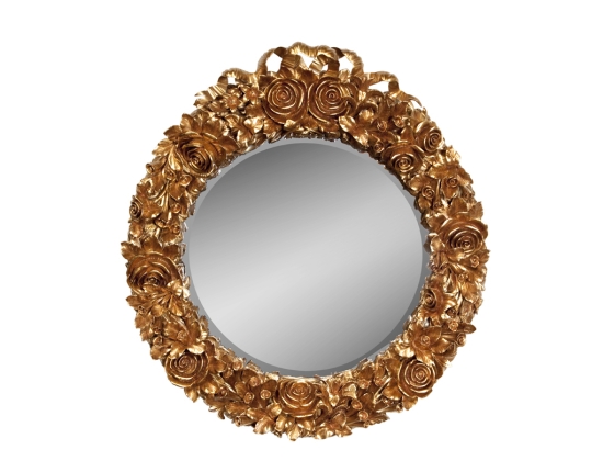 Clear beveled mirror in solid Mahogany carved frame with rose detail. Available in Faux Gold and Faux Silver leaf.