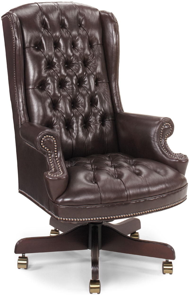English traditional diamond tufted executive chair. High back with nail head trim standard. Available in numerous leathers and fabrics. Seat Depth: 17½” Arm Height: 26”-30½”