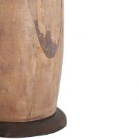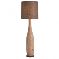 This wooden bowling pin inspired floor lamp has a rustic iron disk base and is topped with a textured mushroom brown linen drum shade with cream cotton lining. French wire and 3-way switch.