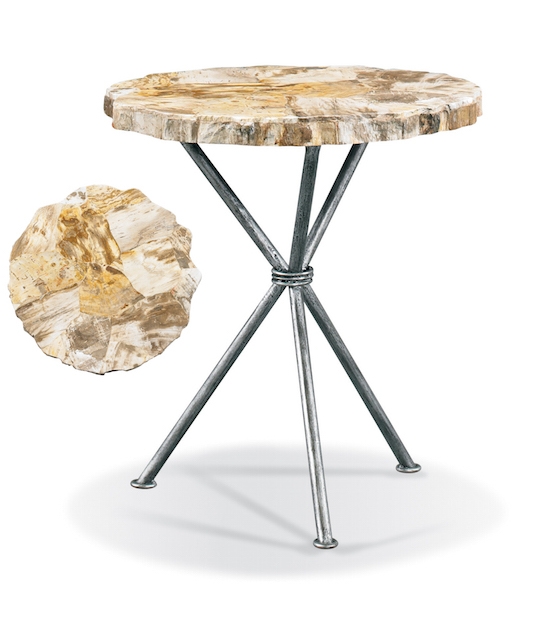 Unique petrified wood table with iron tripod base. This table is made up of slices of petrified wood with a petrified live wood edge,