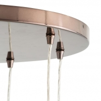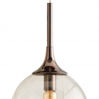 Seven smoked glass spheres spiral downward from the large round brown nickel canopy, seemingly to float through the air. Perfect for any vertical space that needs drama and sparkle. Shown with radio bulbs.