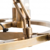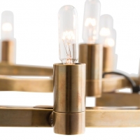 This ring-inside-a-ring brass chandelier has 18 lights and is finished in antique brass. Each of the sockets pivots 320 degrees so the bulbs can be turned at different angles.