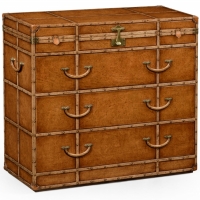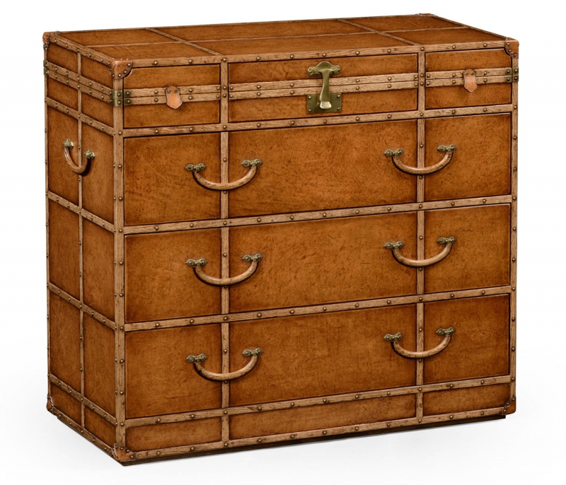 Leather and oak bound travel trunk style dressing chest with three fitted upper drawers. Three drawers beneath lined with vintage map detailing. Patinated metal fittings throughout.