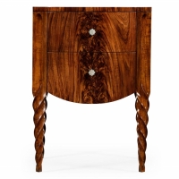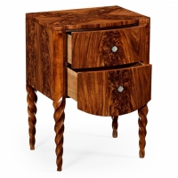 Handcarved rectangular walnut finish chest of drawer with twisted legs and a top with decorative bookmatched tropical crotch walnut, mother of pearl inlay handle.