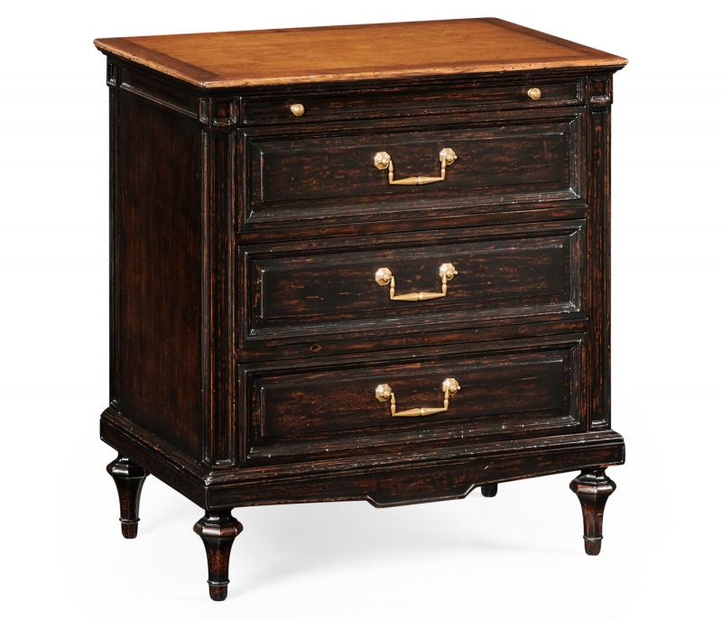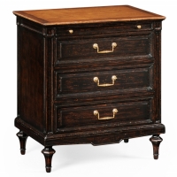 Walnut Directoire style bedside chest, the natural walnut finish top above an ebonised finished base, three graduated panelled drawers with patinated brass handles set on octagonal baluster feet and a geometric low rail. Slide to top section.
