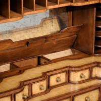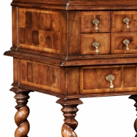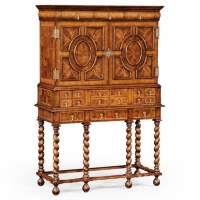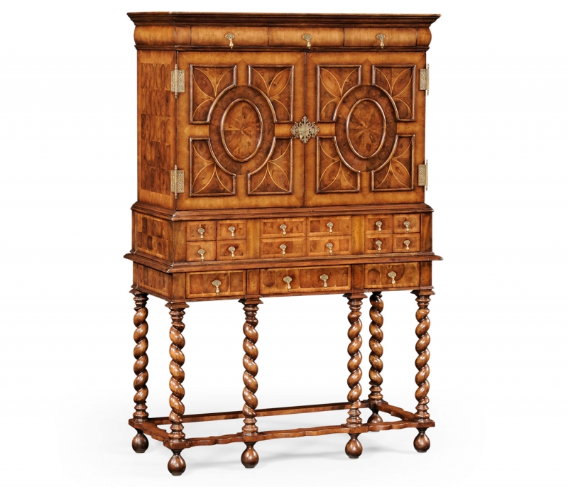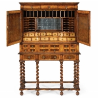 William and Mary walnut secretaire cabinet with fine oyster veneers to the panelled doors, multiple small drawers to the exterior and fully fitted interior with églomisé lined alcove and shelves, drawers and pigeonholes. The whole raised on an open base with barley twist legs and serpentine stretchers.