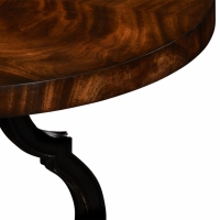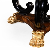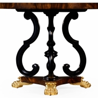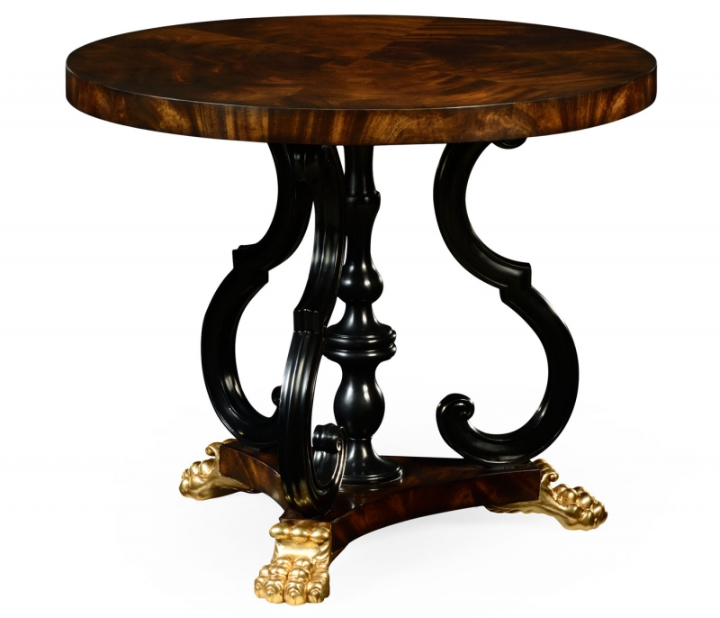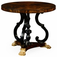 Powerfully designed crotch mahogany veneered circular center table with baluster central column and scrolling ebonised legs set on a trefoil base with finely carved and gilded lions paw feet.