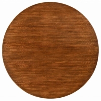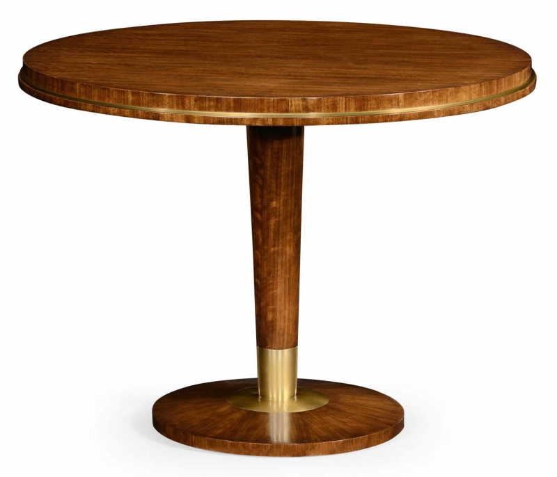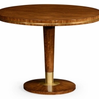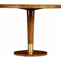 Contemporary styled circular center table, the top and pedestal veneered in decorative hyedua with distinct geometric grain, mounted with sleek brass details.