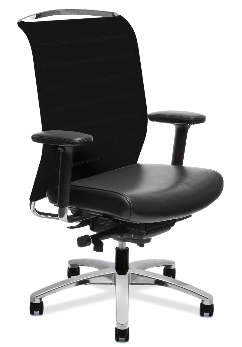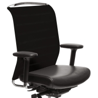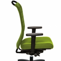 Automatic self-adjusting synchronized mechanism. Easy adjust sliding seat is standard. Fully adjustable rotating armrests. Upholstered or knit back available.