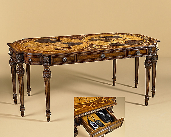Regency styled desk with intricately inlayed marquetry veeners in the design of the split hemisphere globe. Hand carved fluted Mahogany legs off set the beautiful yet praticle computer ready top. It comes with computer keyboard drawer, Marquetry gormets, and concealed power bar.
