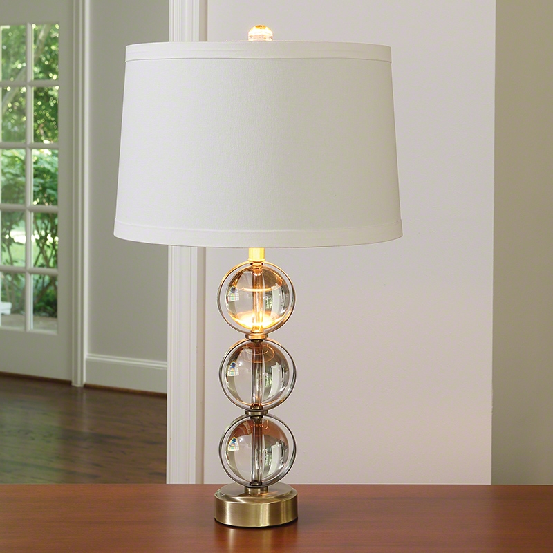 Three crystal orbs centered between brass finished bands sit stacked on a brushed antique brass finished base and features a small round crystal finial. The silk shade lined in gold foil adds warmth, creating a radiant atmoshpere.