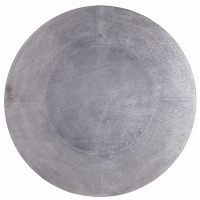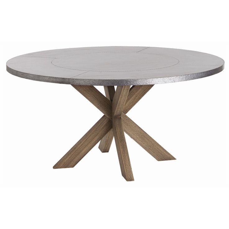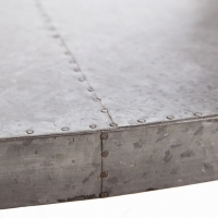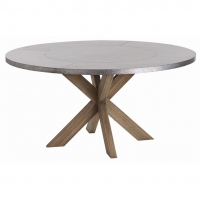 This 60" table is made of solid wood which has been waxed to maintain the natural color. The top has been clad in galvanized steel and attached with small nail heads in a circular pattern.