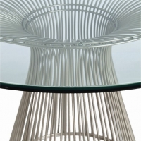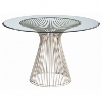 Round table with modern pedestal base made from thin iron rods in a brushed nickel finish and topped with a beveled glass top.