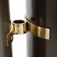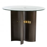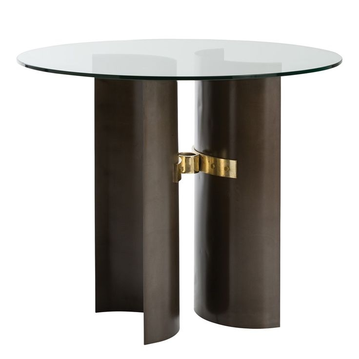 Start with an iron drum, slice it in half, then turn the curves so they are back-to-back and attached with a solid brass coupling. Add the clear glass top and you have a strong, stable and modern table.