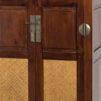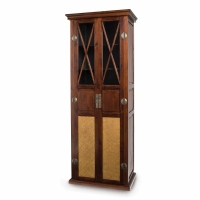 Plantation hardwood frame with clear glass panels and inlaid cane matting. Five adjustable shelves with fixed bottom shelf. Accented with brass hardware.