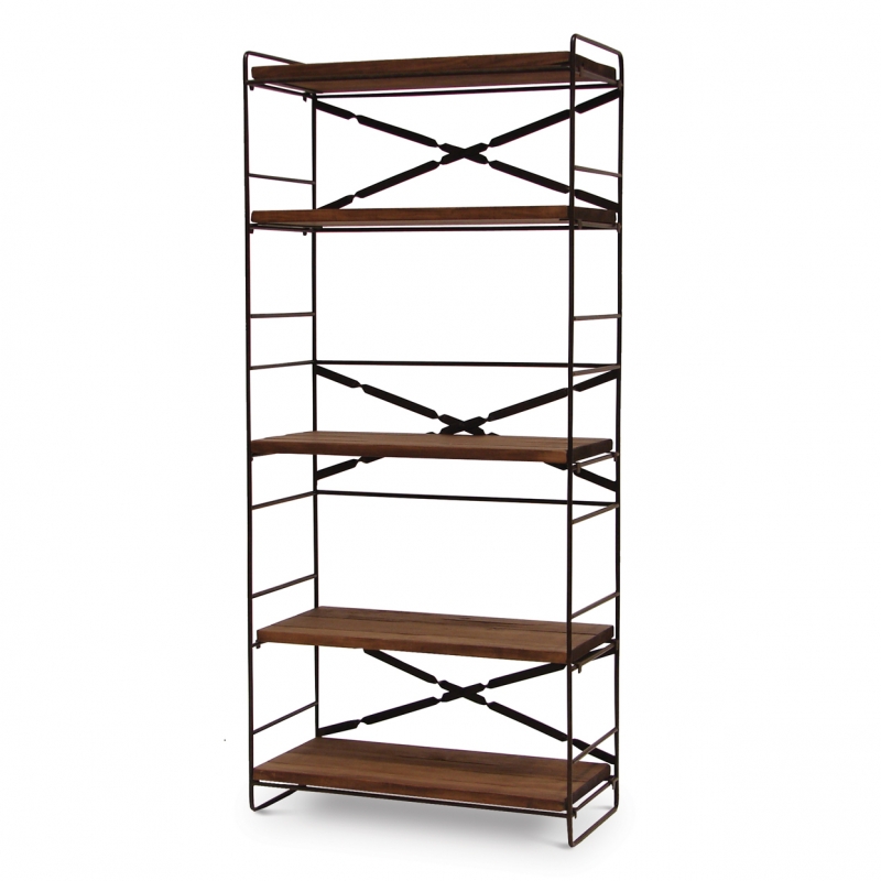 Plantation hardwood shelves. Twisted flat metal bar frame with metal rivets. Uneven planks give appearance of age. Five adjustable shelves.