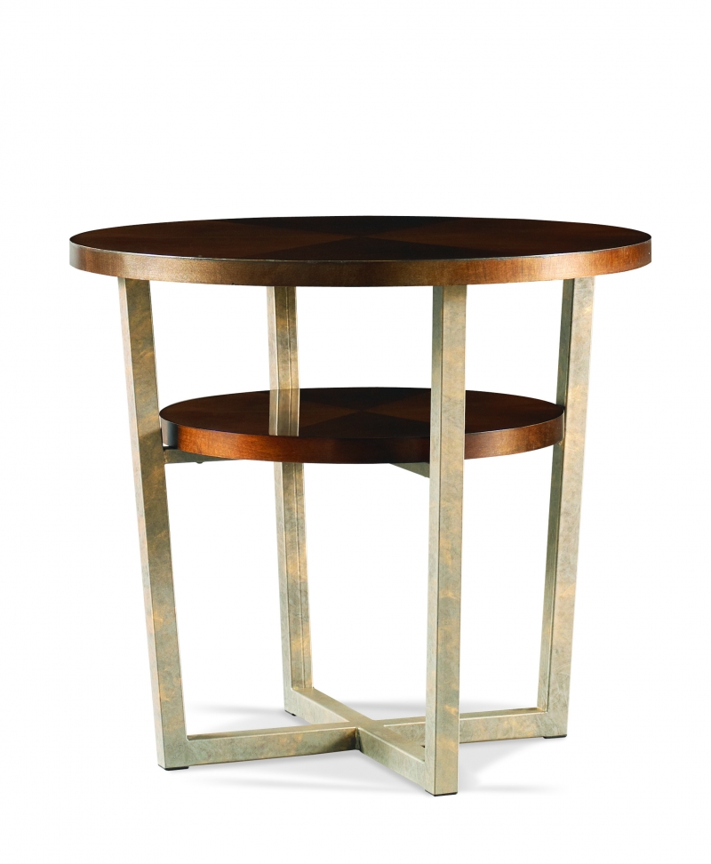 Handsome round lamp table design with a mid-shelf and a pie-cut maple veneer top on a square stock steel frame in a standard matte platinum finish.