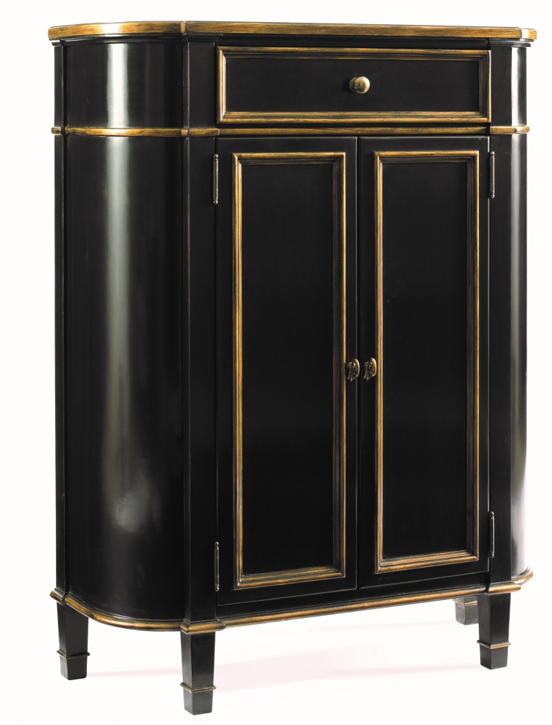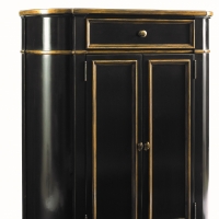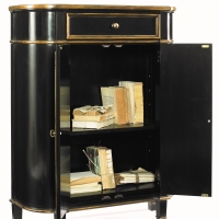 Tall hall console chest in a regency black finish with aged gold accent striping. Two doors with an adjustable interior shelf and one working top drawer.
