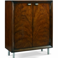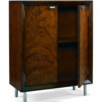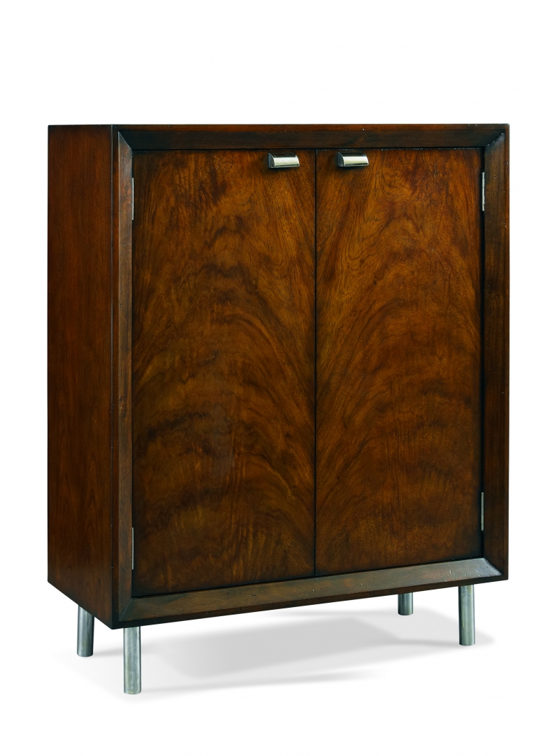 Sleek two door cabinet in a very mid-century modern form with polished nickel door hardward and legs. Medium brown on walnut solids and veneers. Two adjustable shelves.