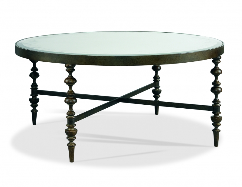 Round cocktail table with an x-stretcher base connecting turned iron legs in an aged bronze finish. Antiqued mirrored top with a beveled edge.