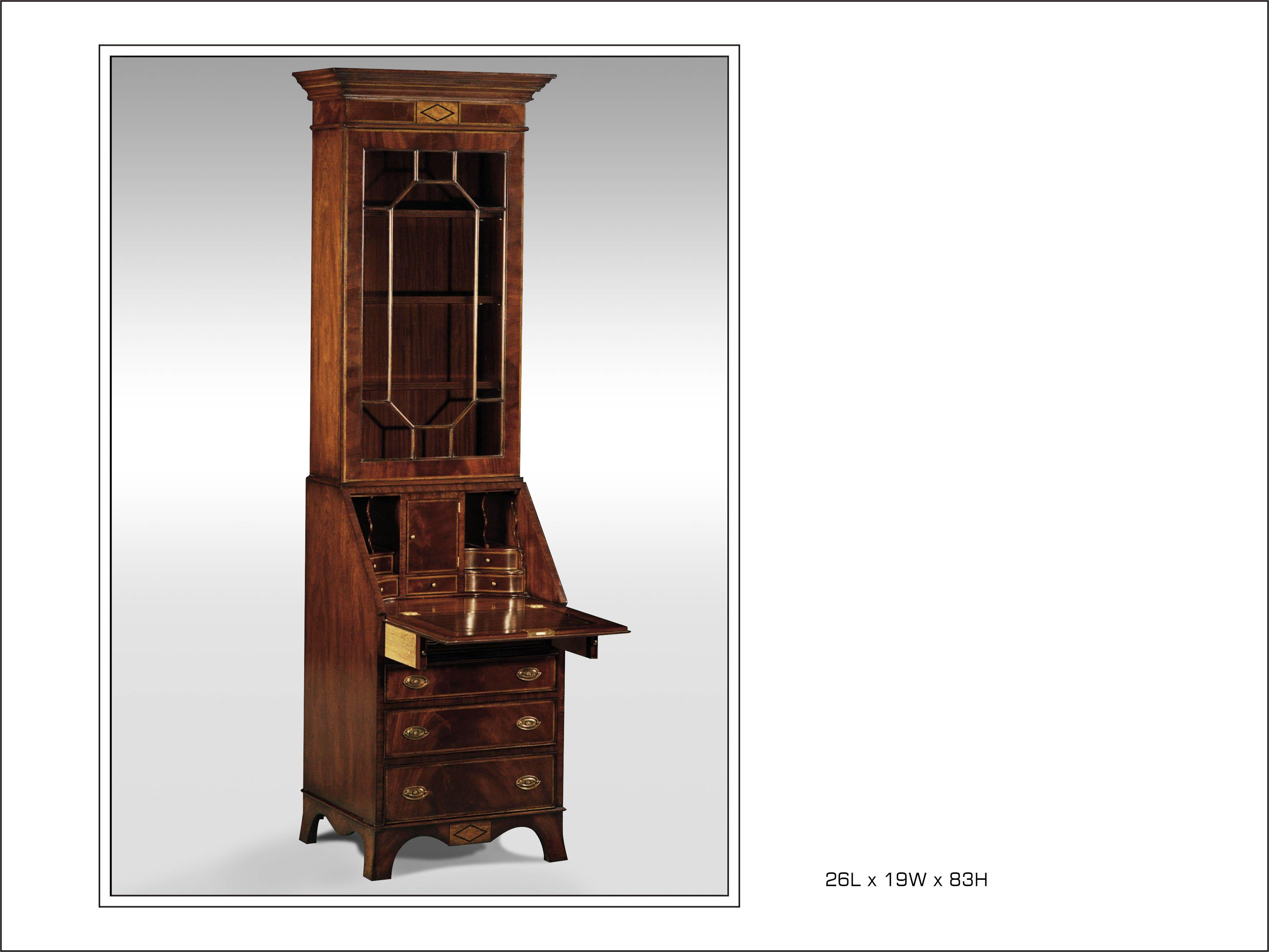 Crotch Mahogony Bookcase with Prima Vera Veneer Inlay, Individually Glass Paned Door, Leather Writing Surface and Brass Handles