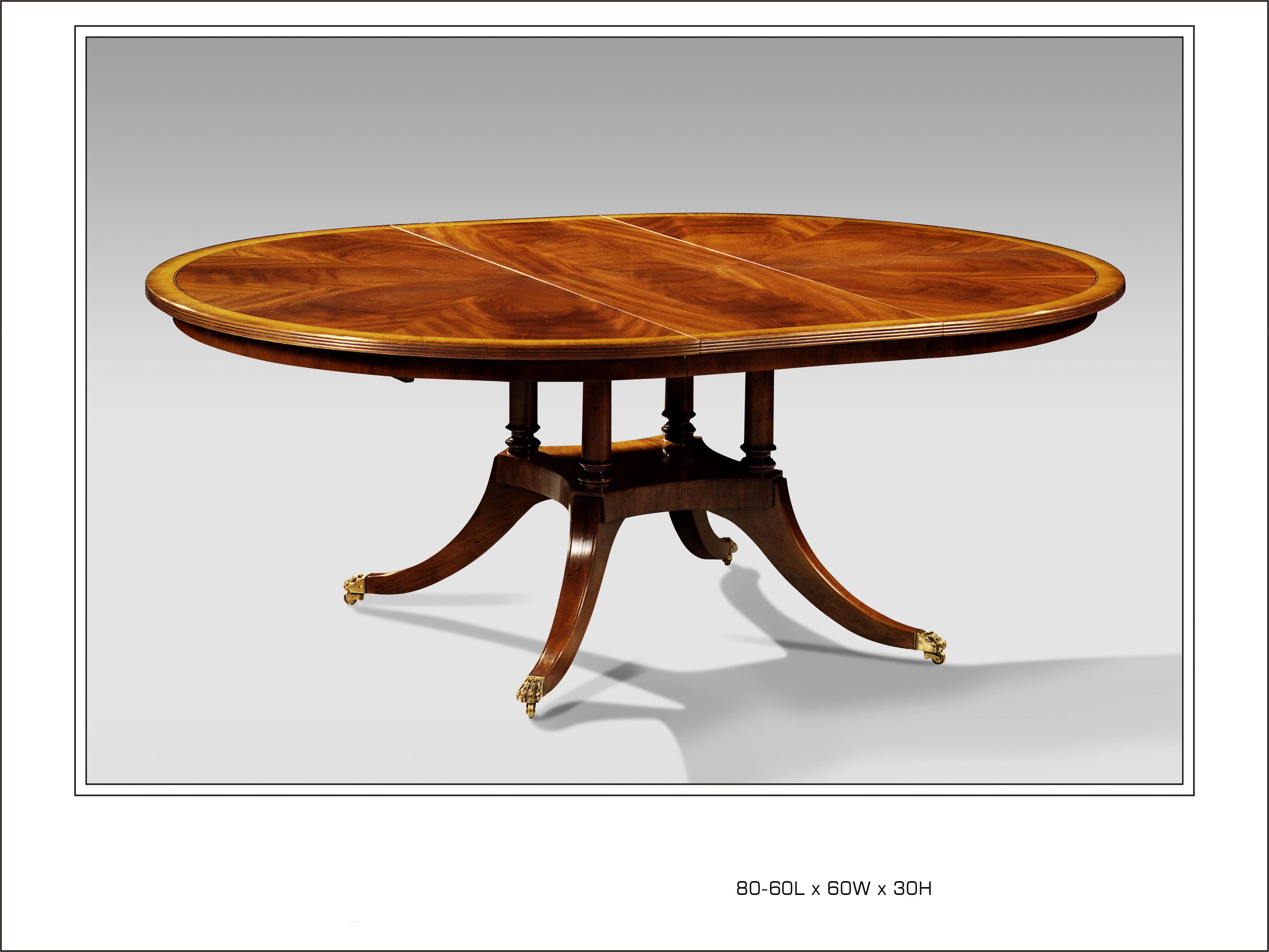 Crotch Mahogany Round Dining Table with Movengue Banding with Brass Castors. One Removable Leaf.