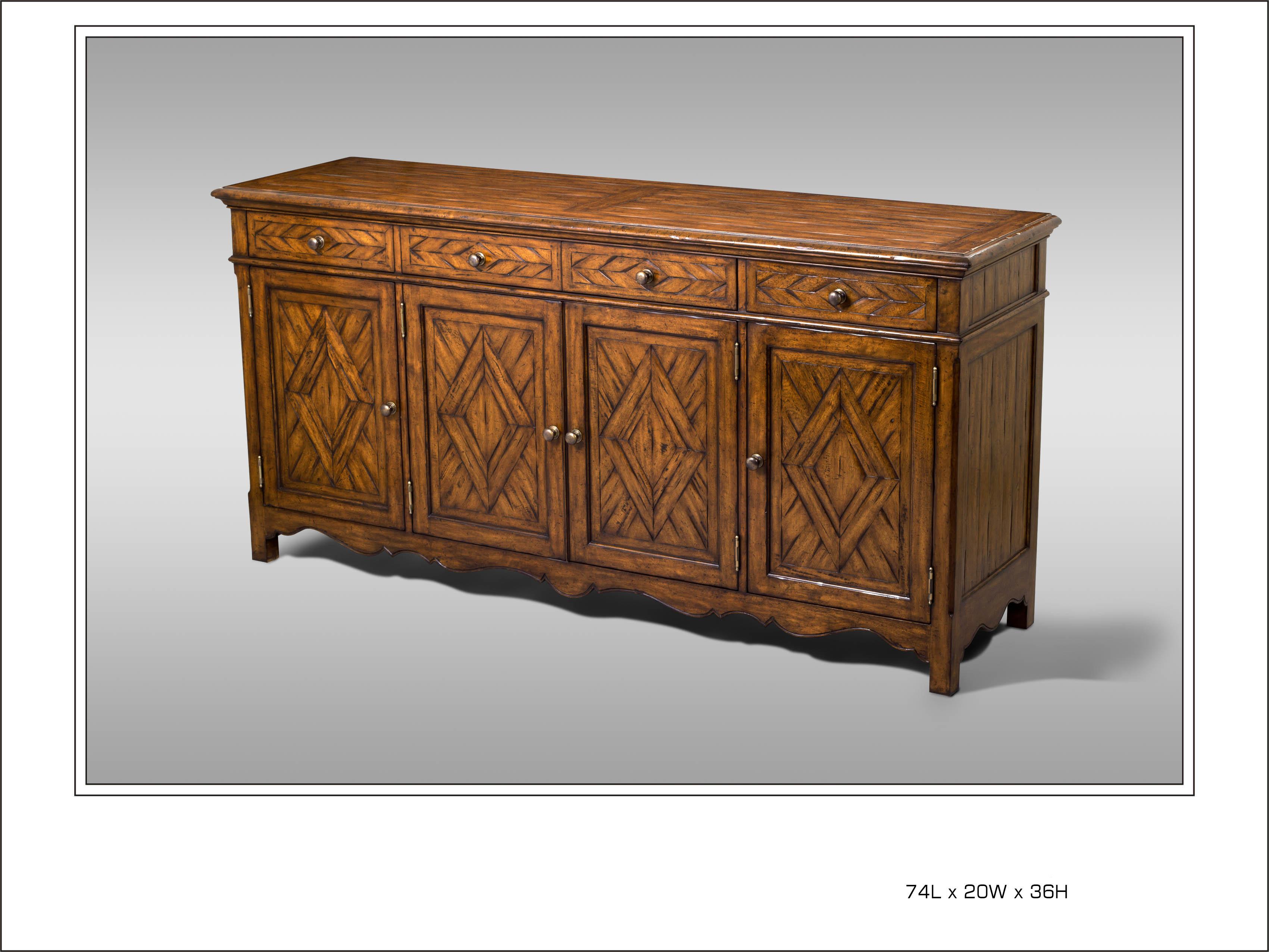 Hand Planed Heavily Distressed Parquetry Sideboard with Antique Brass Knobs