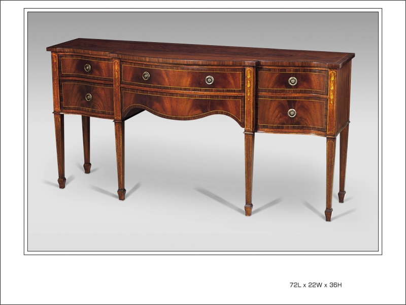 Crotch Mahogany sideboard with Rosewood and Movengue Banding. Tapered Bell flower inlayed spade feet and solid brass Handles