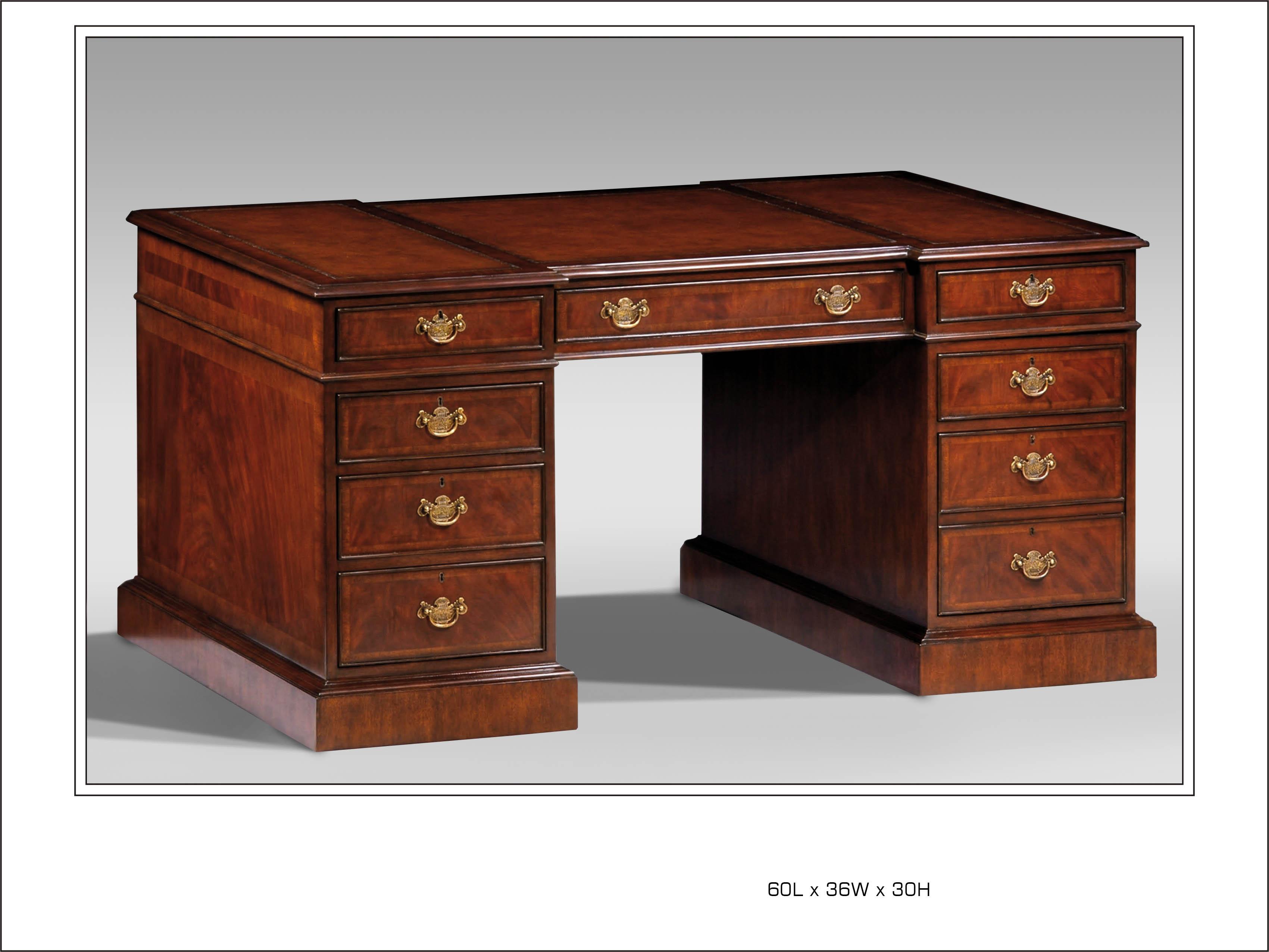 Crotch Mahogany Partners Desk with Antique Brown Leather Top and Brass Handles. File Drawer Left Side Front and Back.