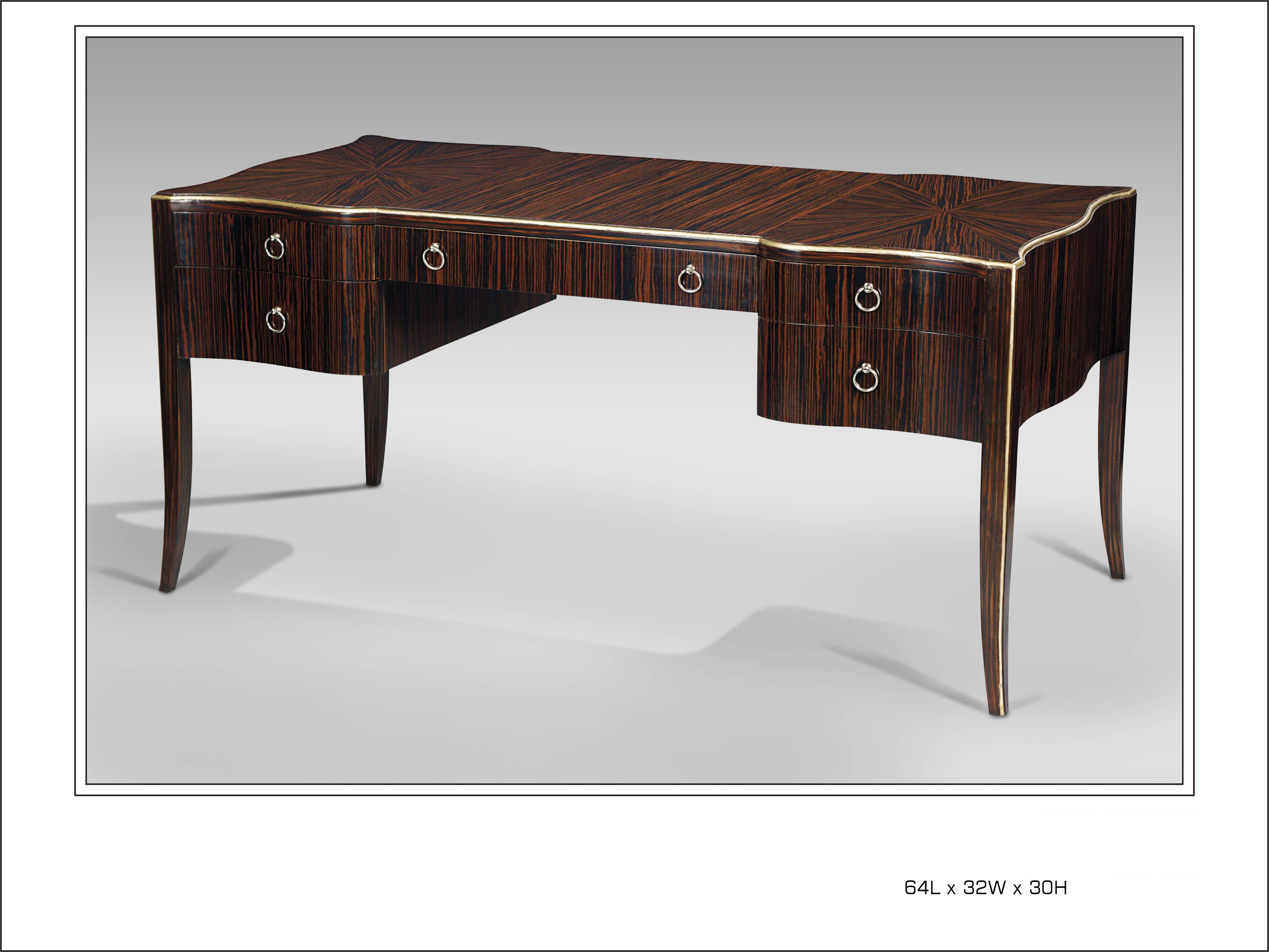 Engineered Macassar Ebony Writing Desk. Nickel Plated Brass Handles with Antique Silver Leaf Trim.