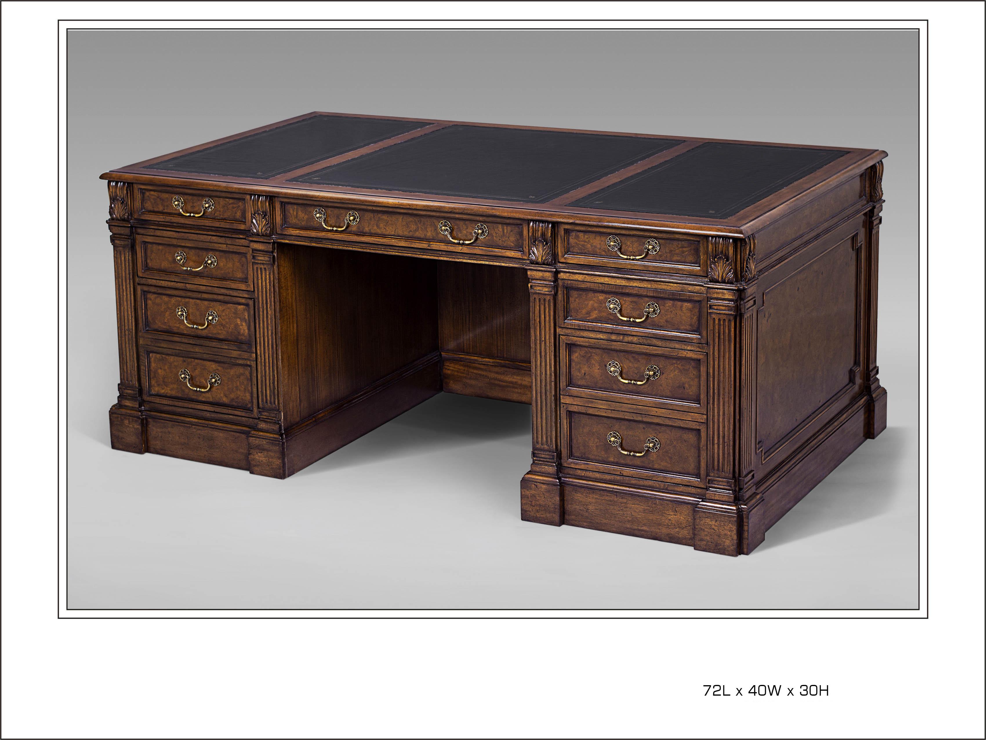 Myrtle Burl Writing Desk with Hand Tooled Leather, Left and Right File Drawers with Doors on Opposite Sides. Solid Brass Handles.