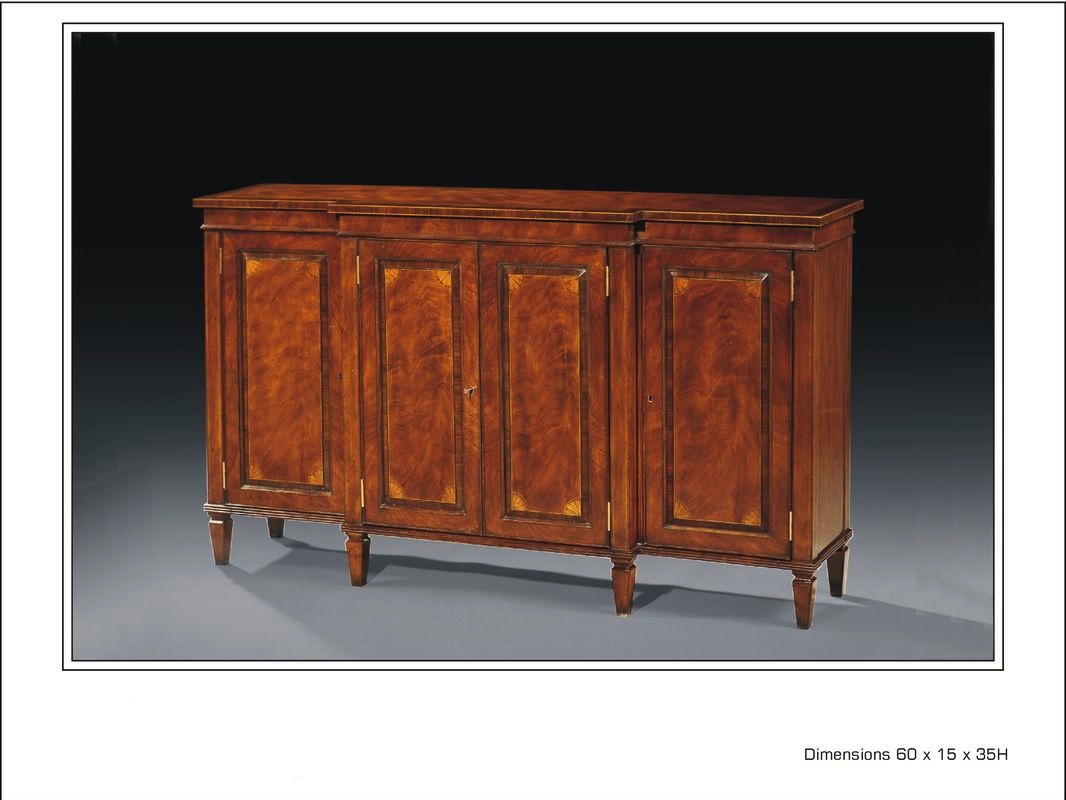 Crotch Mahogany and Rosewood Sideboard with Center Cutlery Drawer. Available in Walnut.