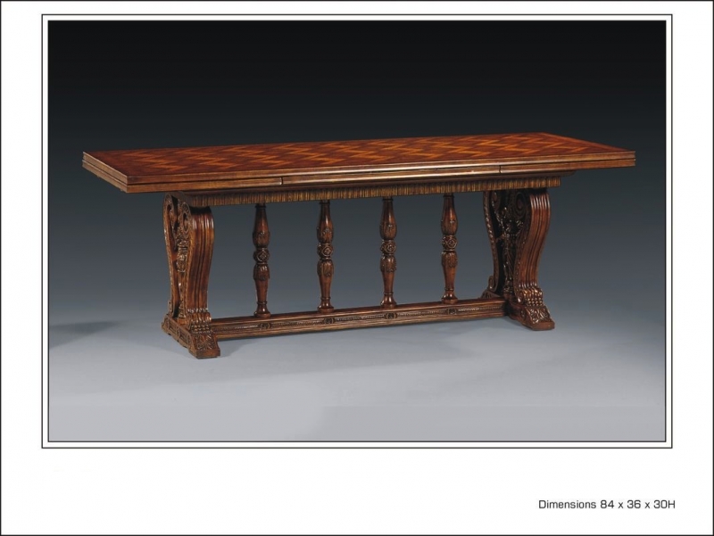 Dining table with two pull out leaves. Walnut parquetry top with beautifully carved base. 84-132inchW x 36D x 30H