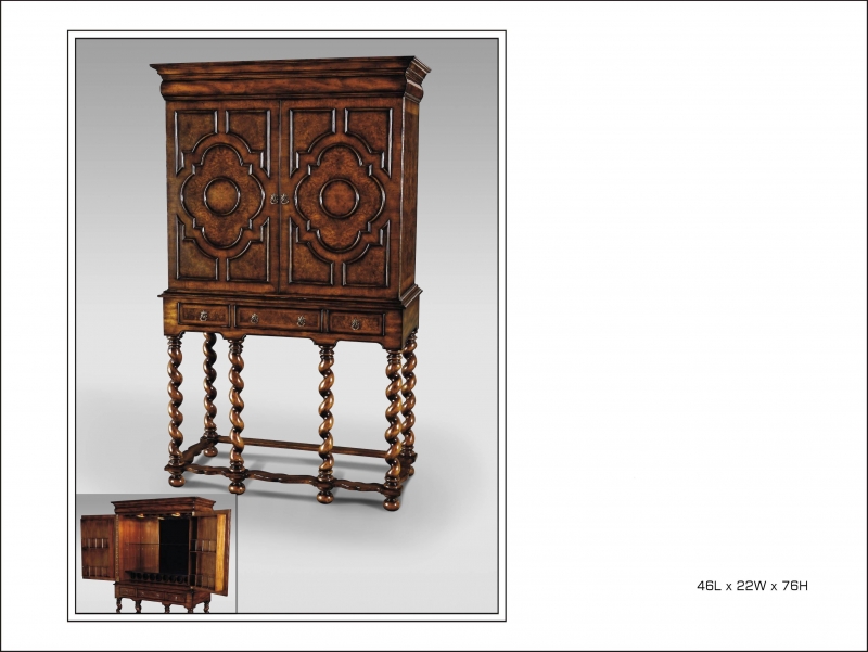 Fabulous bar on stand in Burl Walnut with Barley Twist legs. Mirrored back interior with touch lighting