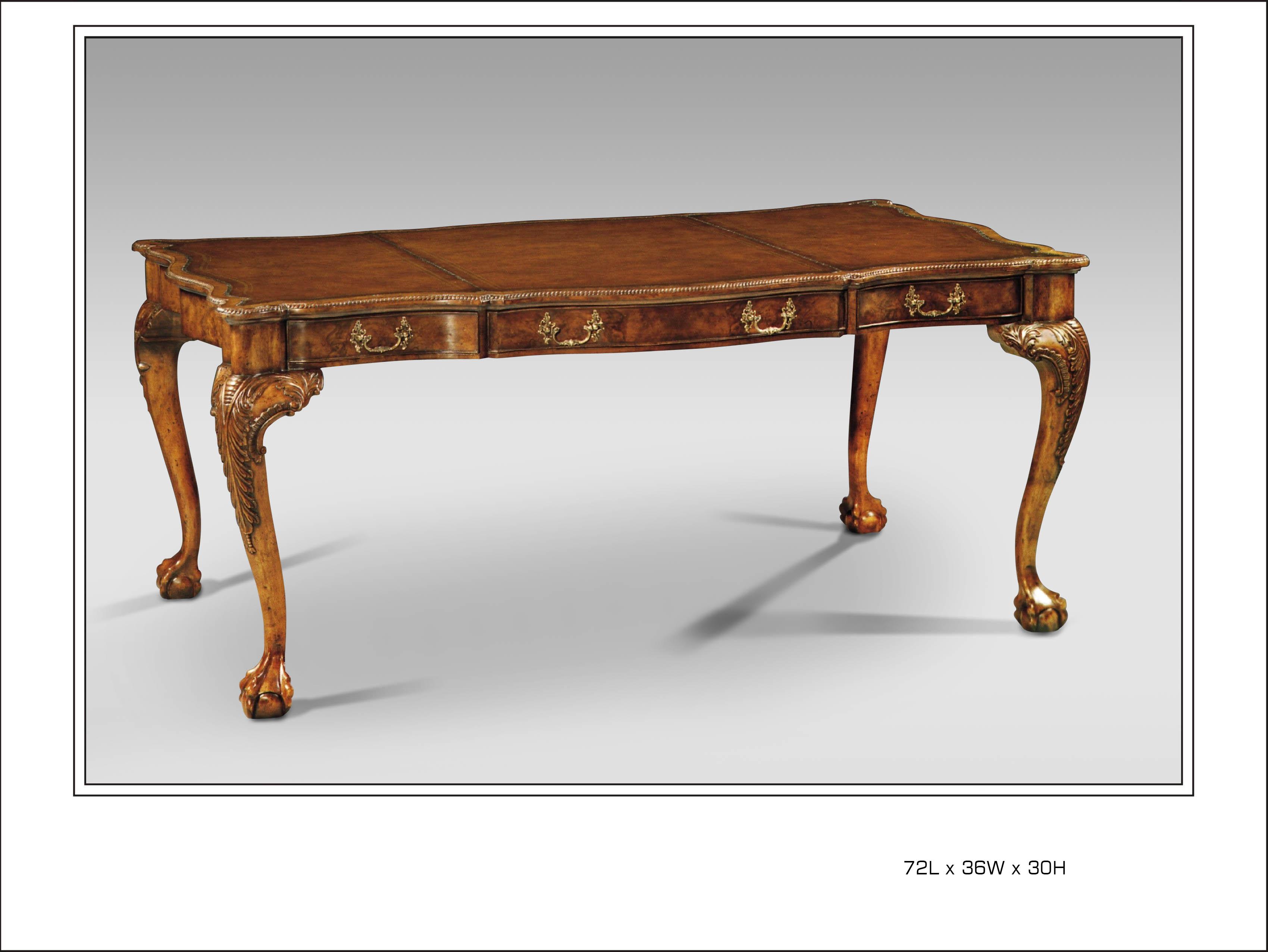 Burl Walnut Writing Desk with Antique Brown Leather and Brass Handles