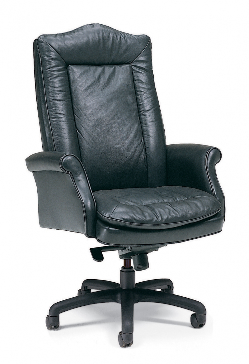 Fully upholstered high back swivel chair with envelope back and Seat. Special knee tilt base and gas lift. Available with wood base as well.